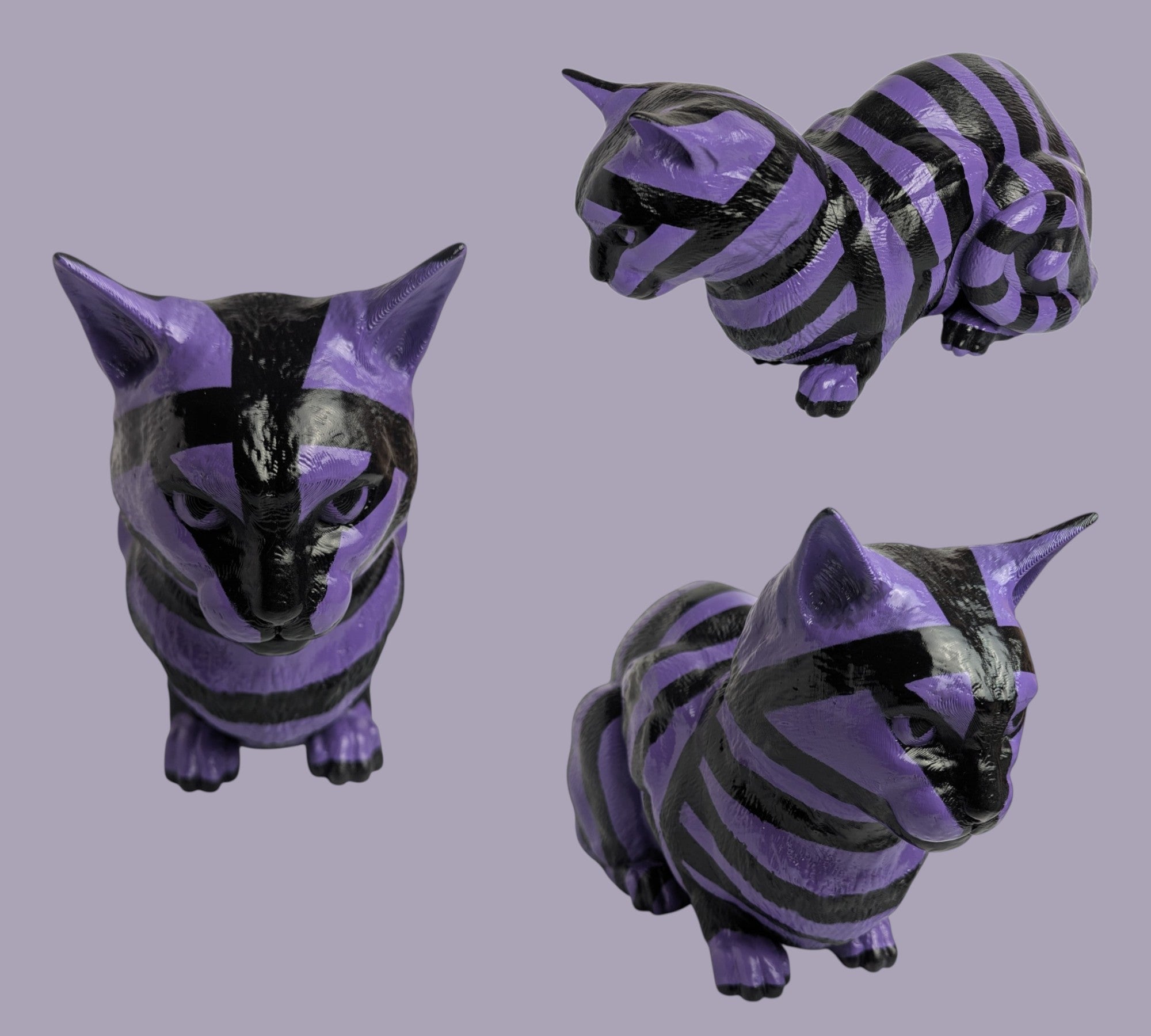 A whimsical life-size cat statue inspired by Alice in Wonderland. Sculpted digitally and painted entirely by hand in the Bay Area.