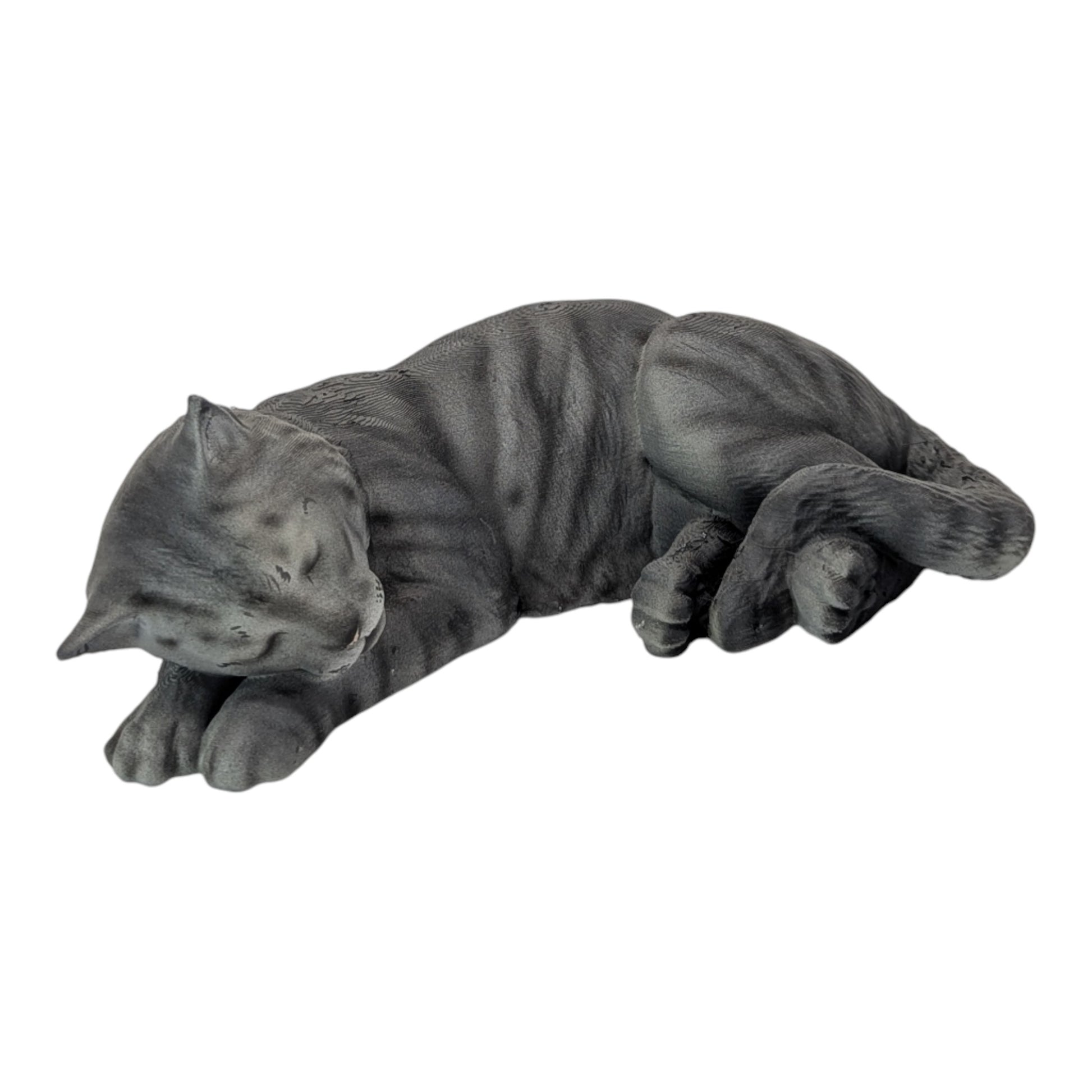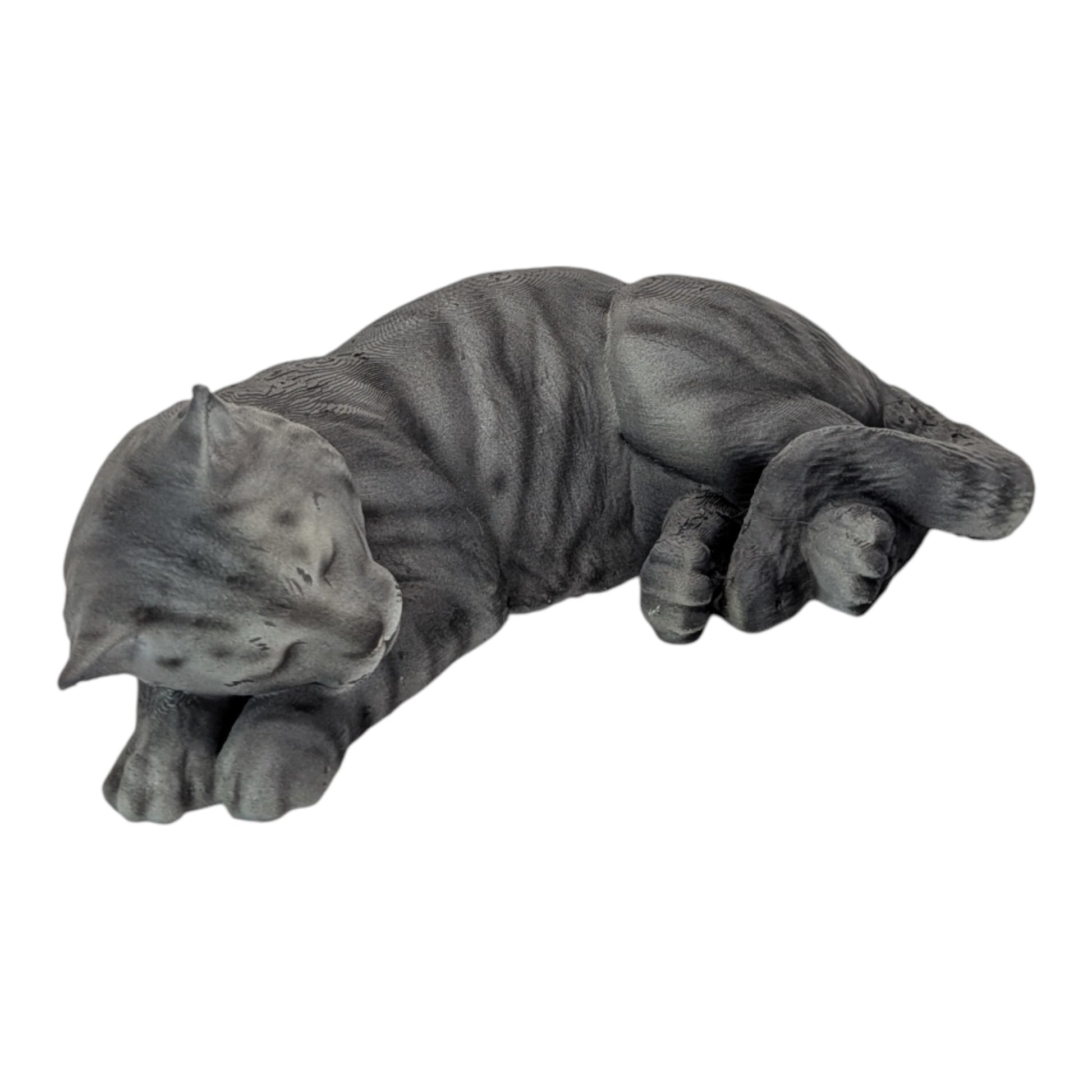"Steel" was our very first test of the peaceful, sleeping cat pose, a design that would later become our 'Luna' model. This piece was an early canvas for our artists to test a unique, cool-toned gray paint scheme, which instantly earned him the name 'Steel.' As an early test piece, he's not 'perfect'—but he is one-of-a-kind. He has visible 3D print lines and an early test paint job that our artists used to perfect their process. These "perfect imperfections" are the marks of a true studio original, and they're what make him a unique part of our story.