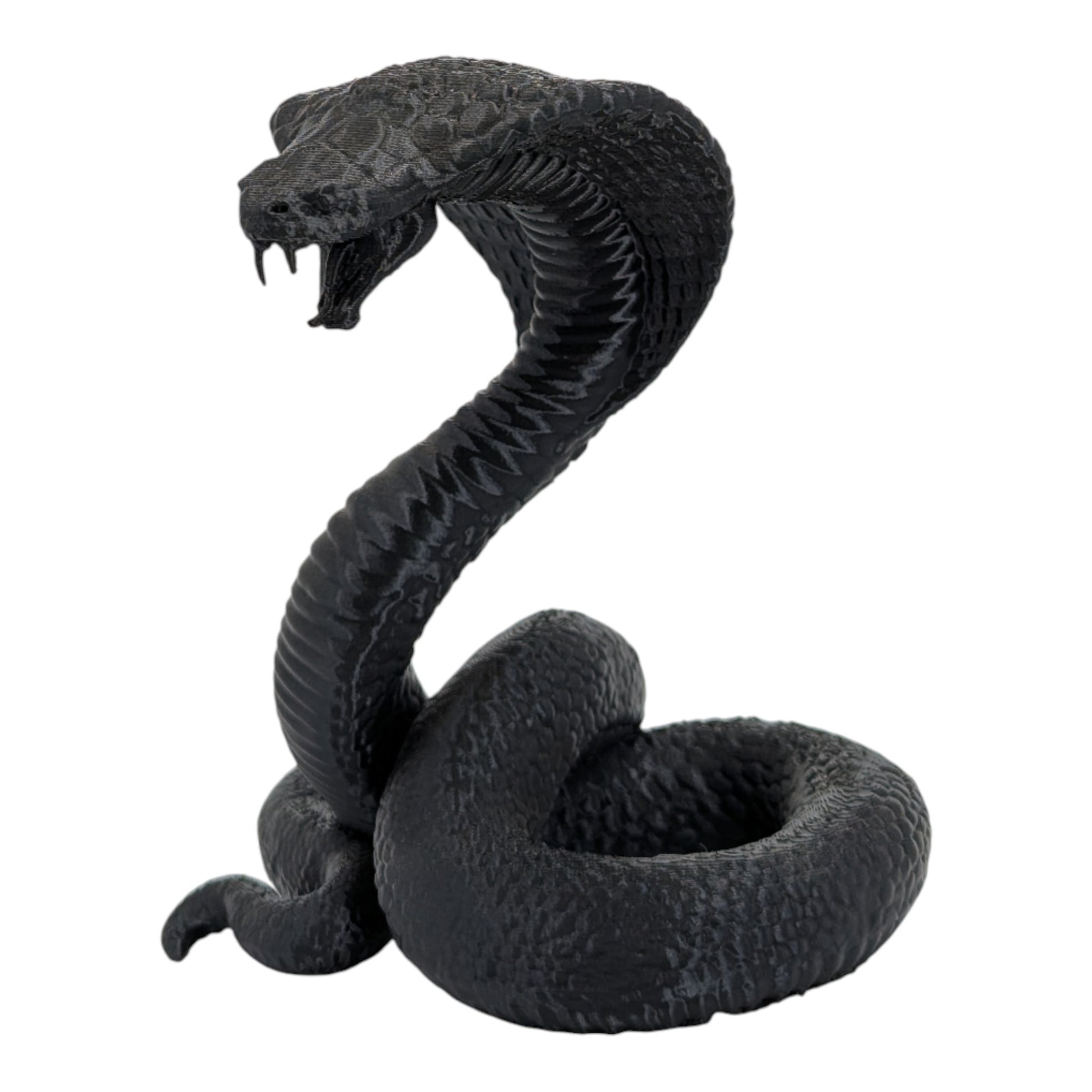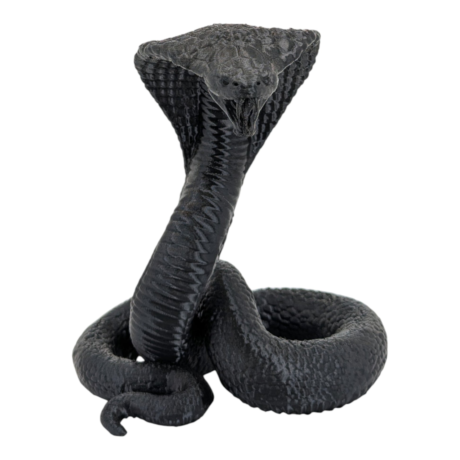 - An intricate, high-resolution 3D printed model of a cobra in a coiled pose.