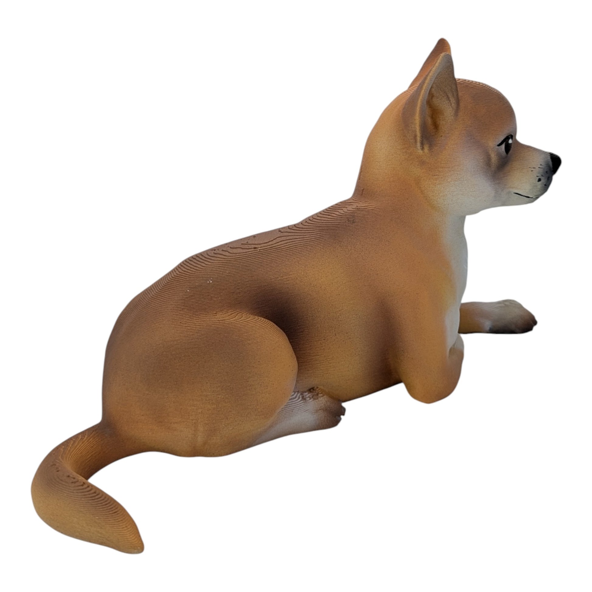 "Milo" was one of the very first Chihuahuas we created, an early test of the peaceful, lying-down pose. As his name suggests, he is the picture of "chill," capturing the quiet, cuddly side of the breed. As a prototype, he's not perfect—but he's full of character. He has visible 3D print lines and a test paint job that our artists used to perfect their process. These "perfect imperfections" are the marks of a true, one-of-a-kind test piece, and they're what make him a unique part of our studio's history.