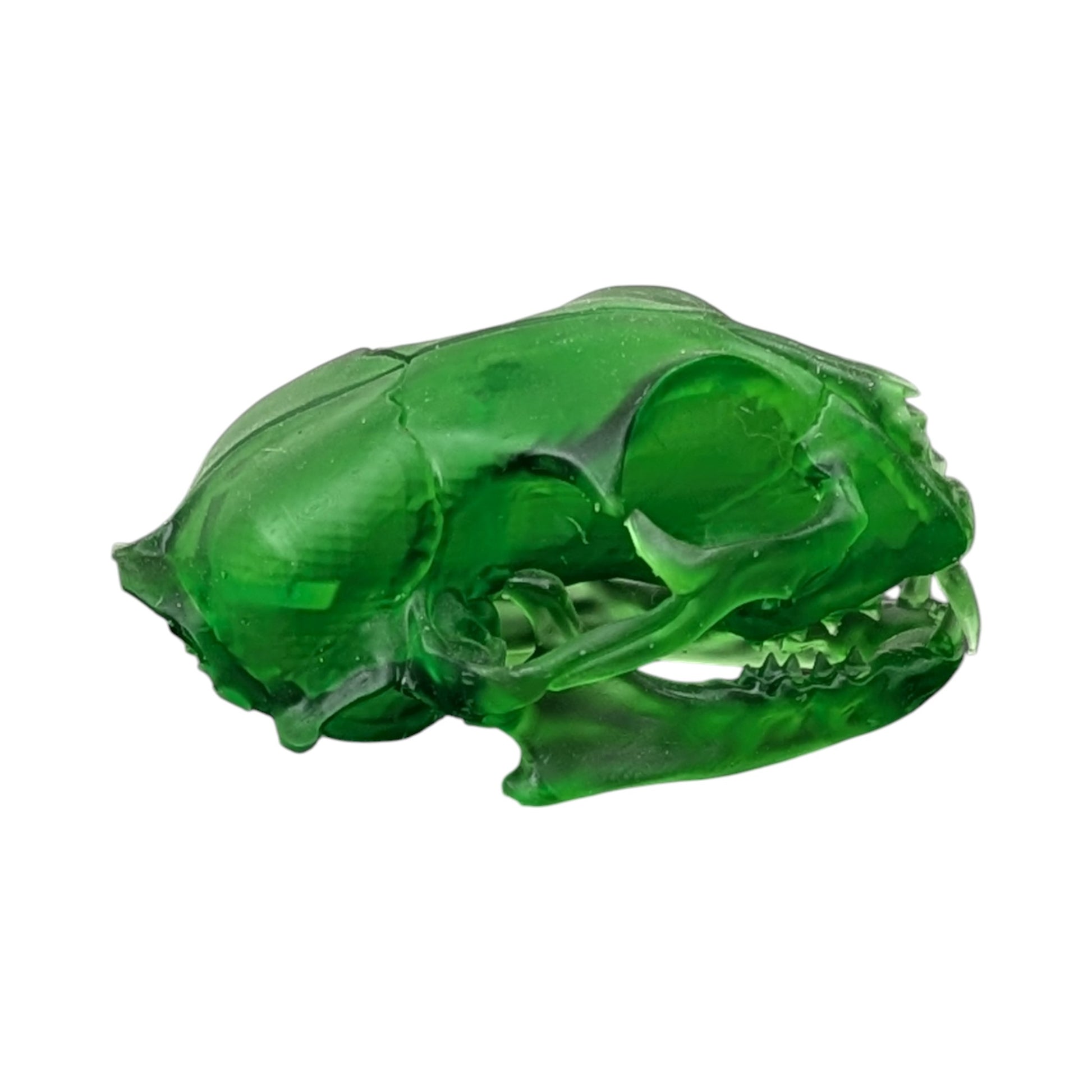 This piece captures the elegance of the feline form in a material that looks like carved jade or green glass. The translucent finish highlights the delicate structures of the nasal cavities and the sharp curves of the canines, turning a biological study into a stunning art object.